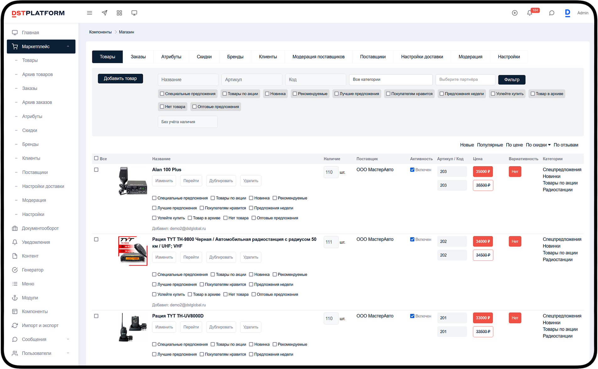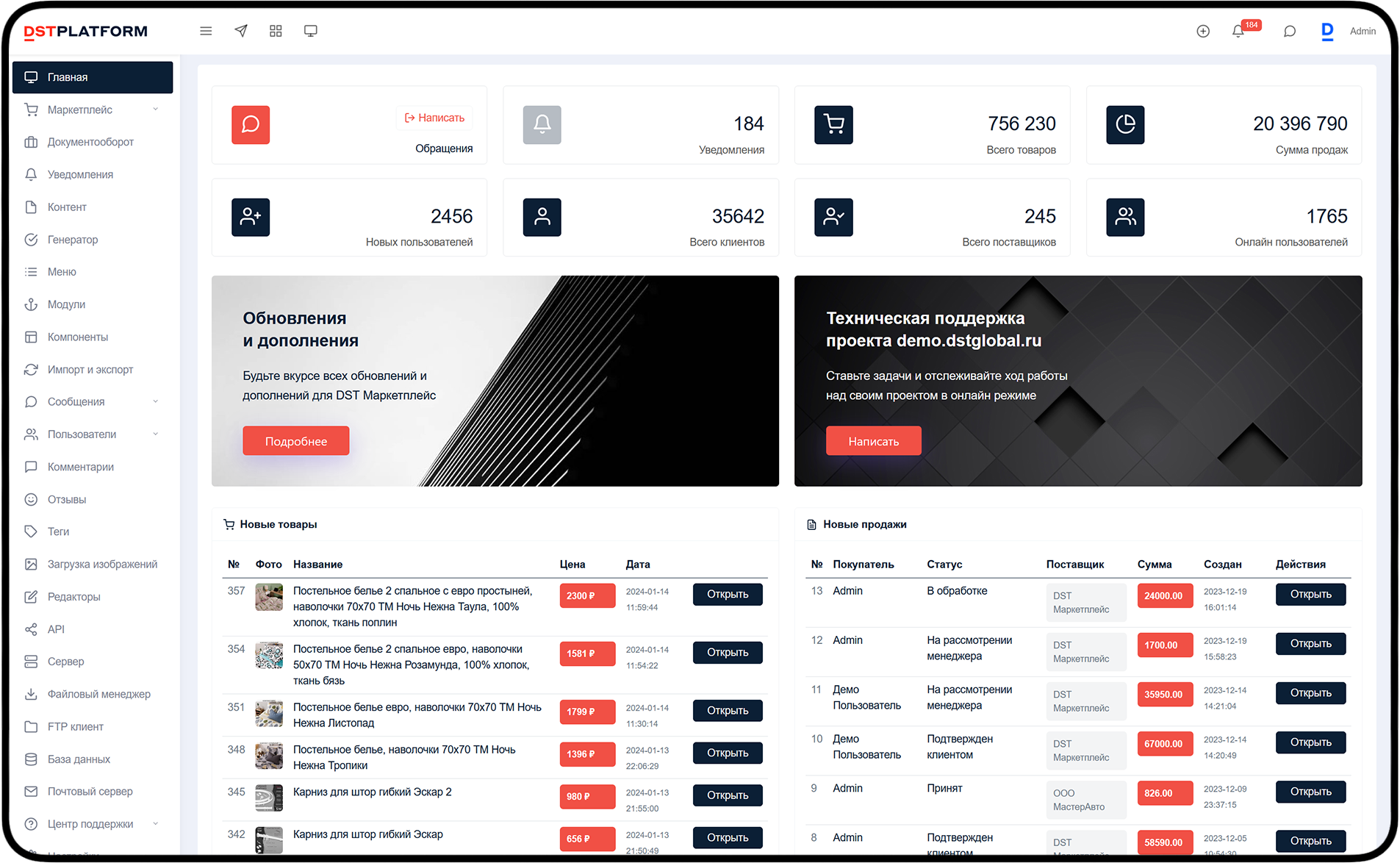 DST Marketplace — это мощное решение для построения полноценных B2B и B2C маркетплейсов. Его модульная архитектура позволяет гибко настраивать логику работы под специфические бизнес-процессы, будь то оптовые закупки с согласованием счетов или классические розничные продажи. Платформа изначально заточена под поддержку многопользовательской среды с разграничением прав, сложными каталогами и интегрированными финансовыми инструментами.